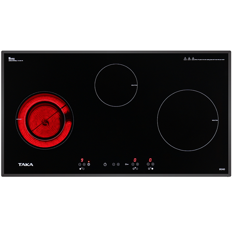 - Bếp điện từ Taka IR3ND gồm 3 vùng nấu hỗn hợp 1 Điện ( hồng ngoại )- 2 Từ
