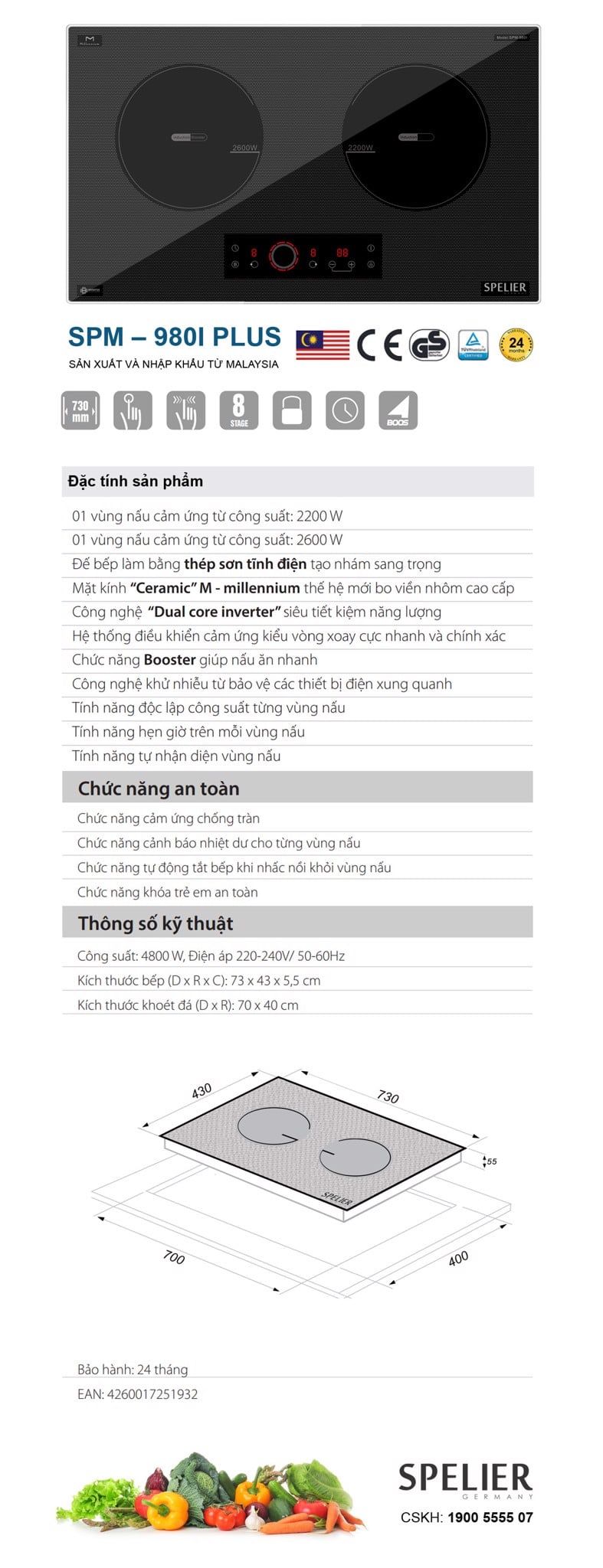 Bếp từ đôi Spelier SPM-980IPlus được sản xuất và nhập khẩu từ Malaysia với 2 vùng nấu từ tổng công suất 4800W